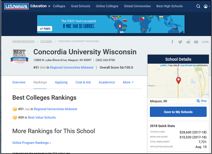美國新聞與世界報道USnews公布了2018年美國本科院校的排名,本科院校排名分為綜合性大型和文理學院,按地理位置又分為地區性大學和地區性文理學院。下面是2018USNews美國中西部地區大學排名,此次排名內容涉及到了學費、學生數以及錄取率等眾多因素。其中在中西部聯盟-橫跨美國12個州的1431所學校中,美國威斯康星協和大學排Top51(US News-America' Best College 2018, University-Master's (Midwest 第一級)。校譽遠超過多所州立公立大學(選官方公布網站